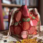 This tabbed drawstring bag will comfortably hold your in progress sock knitting and is suited to small accessory projects. It is approximately 7 inches tall, 14 inches wide and 7 inches deep. A printed twill tape drawstring glides easily through the tabbed bag for quick and ready knitting.