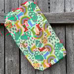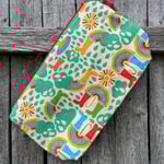 This fully lined large wedge bag will hold three 100 gram skeins of yarn and is suited to most accessory projects. It is approximately 15 inches wide, 8 inches tall and 4 inches deep. A loop handle attaches to the zipper via a swivel clasp for knitting "in the wild".