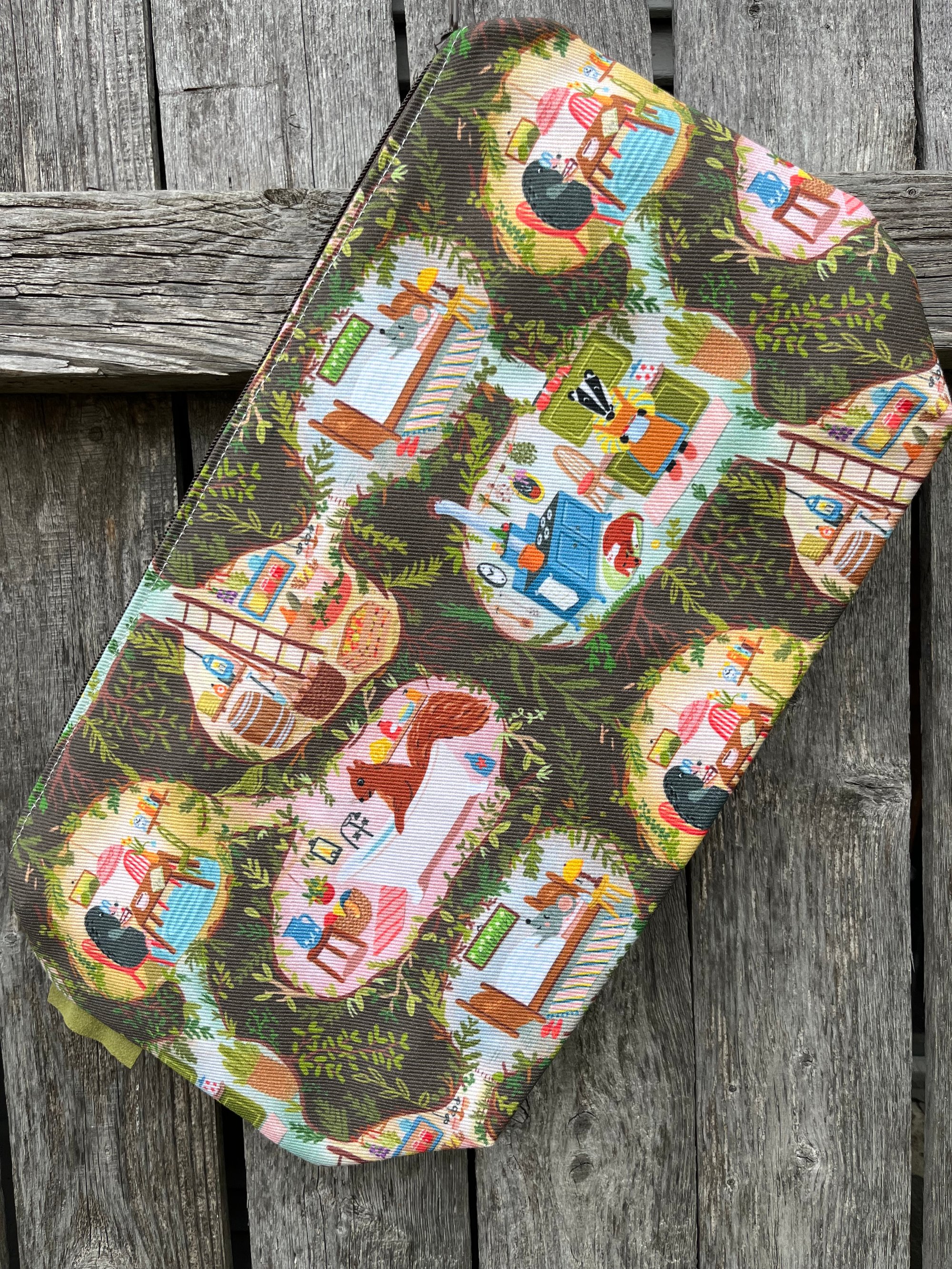 This fully lined large wedge bag will hold three 100 gram skeins of yarn and is suited to most accessory projects. It is approximately 15 inches wide, 8 inches tall and 4 inches deep. A loop handle attaches to the zipper via a swivel clasp for knitting "in the wild".