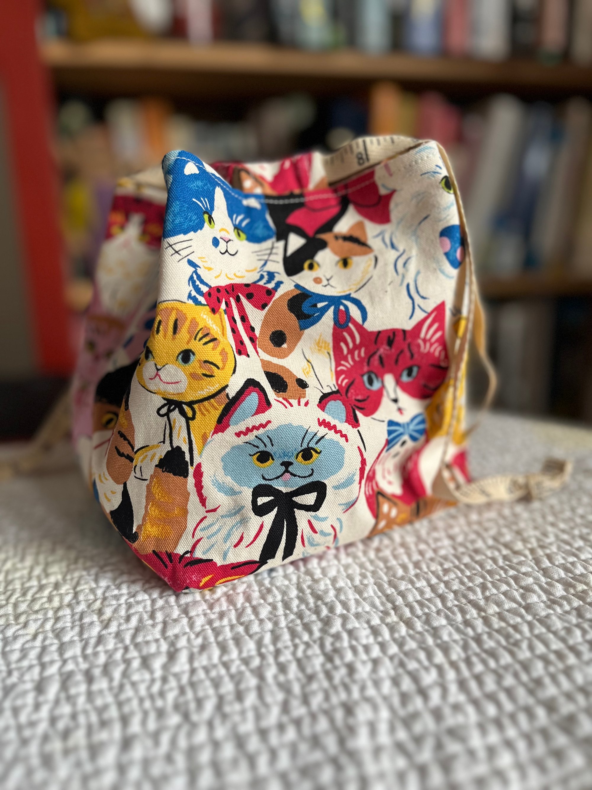 This tabbed drawstring bag will comfortably hold your in progress sock knitting and is suited to small accessory projects. It is approximately 7 inches tall, 14 inches wide and 7 inches deep. A printed twill tape drawstring glides easily through the tabbed bag for quick and ready knitting.