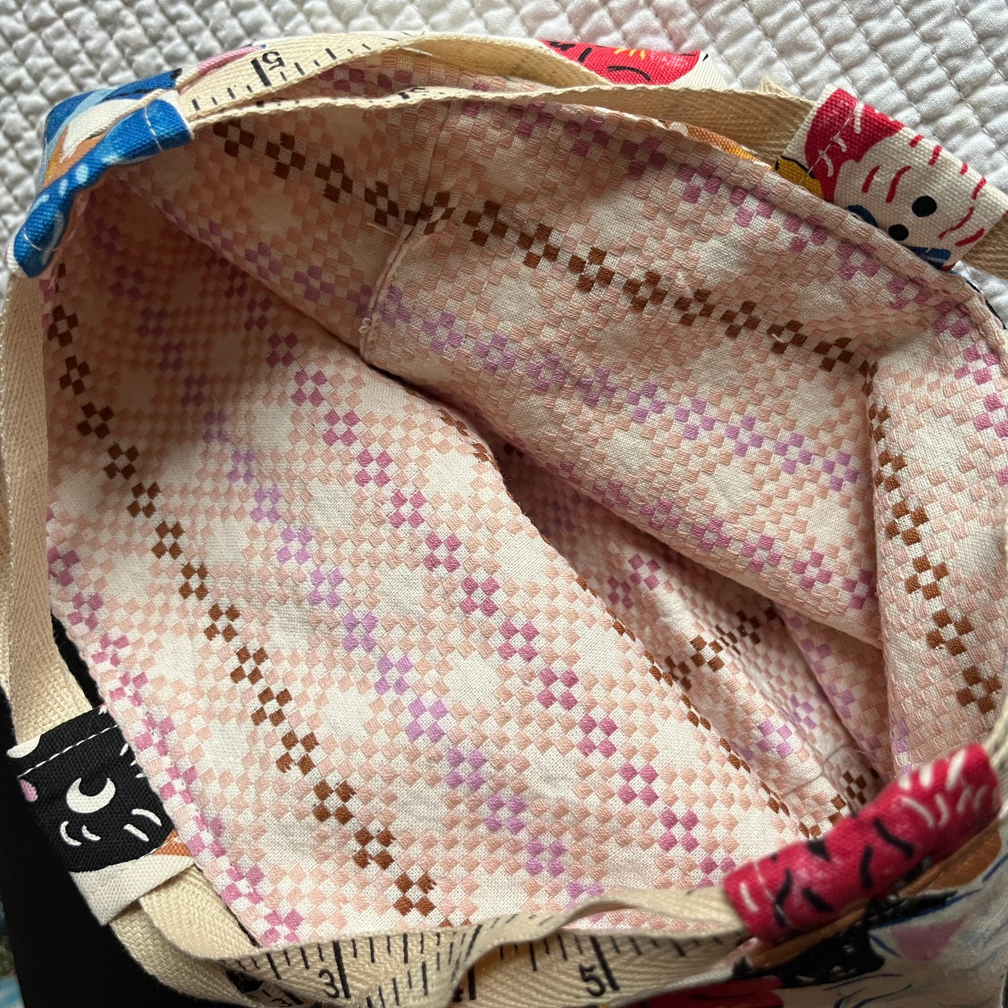 These bags have an Oxford cloth exterior with a contrasting cotton jacquard interor.