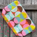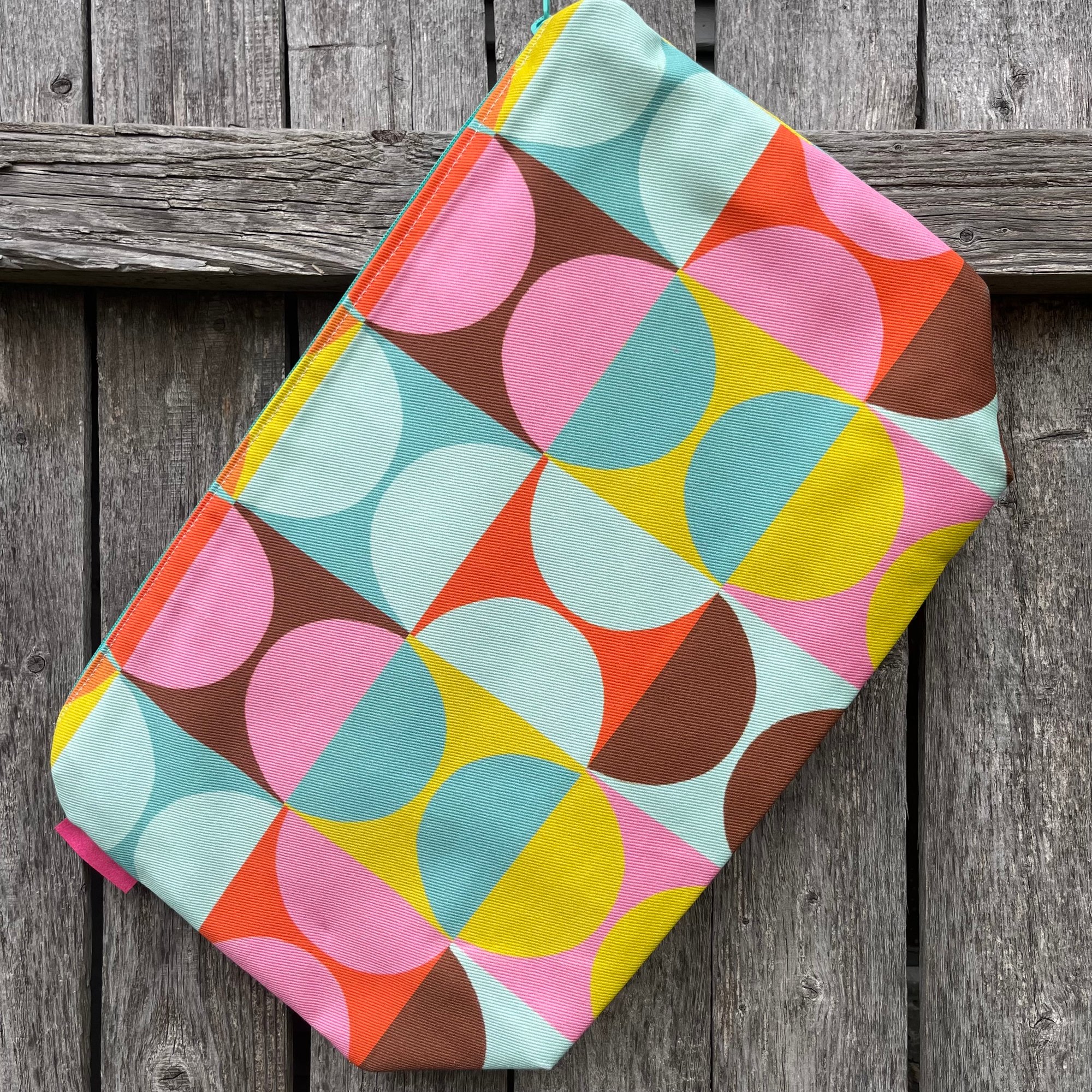 This fully lined sweater bag will hold six 100 gram skeins of yarn and is suited to large shawl and smaller sweater projects. It is approximately 17 inches wide, 10 inches tall and 5 inches deep. A loop handle attaches to the zipper via a swivel clasp for knitting "in the wild".
