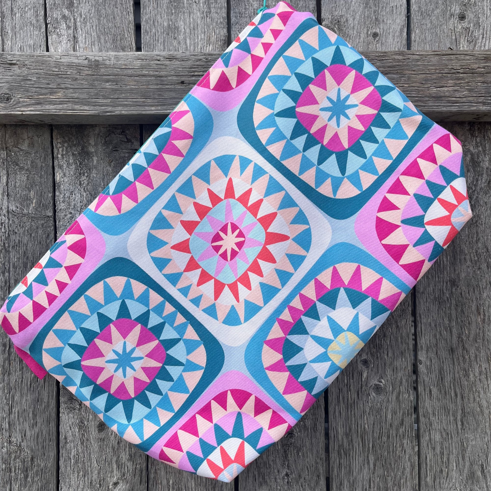 This fully lined sweater bag will hold six 100 gram skeins of yarn and is suited to large shawl and smaller sweater projects. It is approximately 17 inches wide, 10 inches tall and 5 inches deep. A loop handle attaches to the zipper via a swivel clasp for knitting "in the wild".