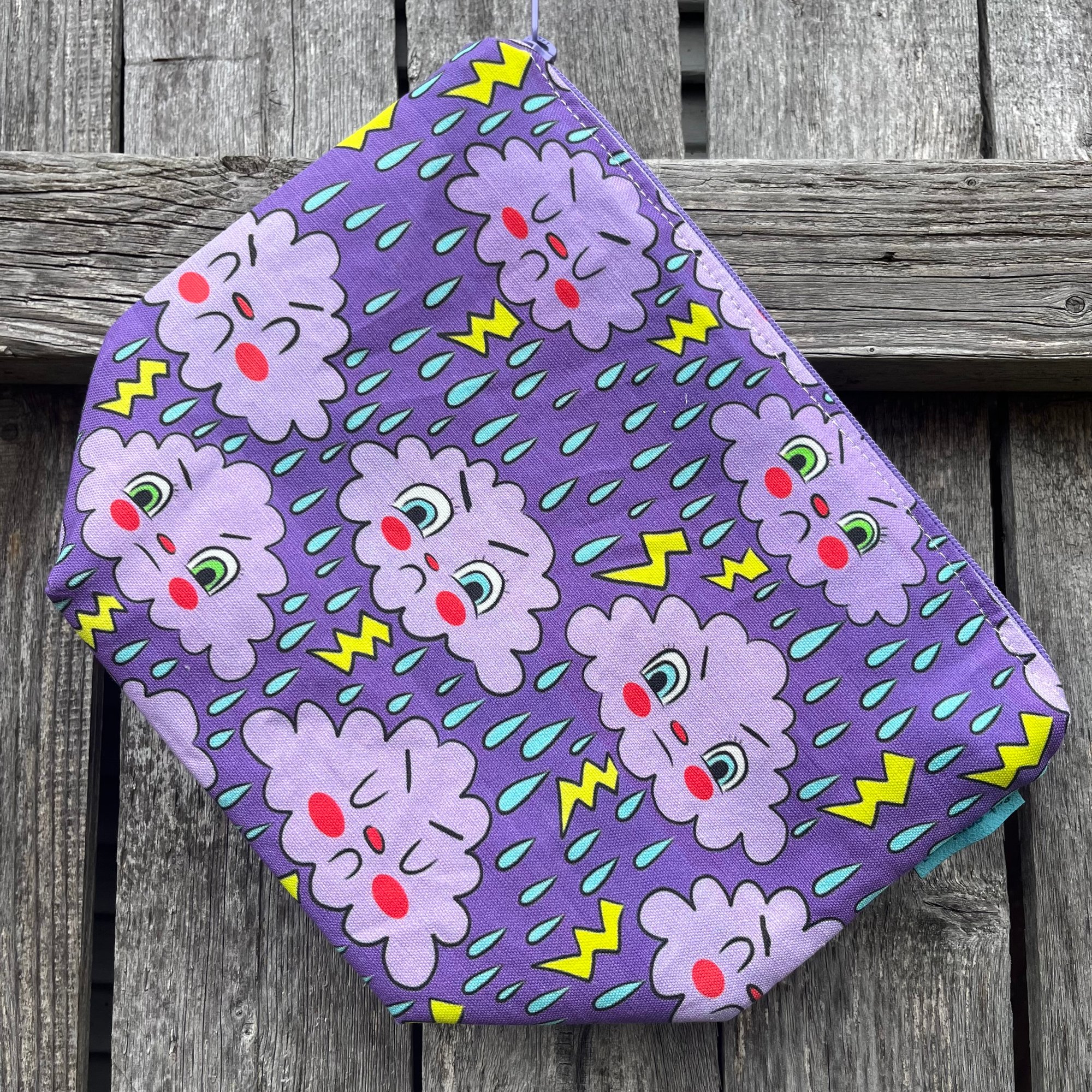 This fully lined sock wedge will comfortably hold your in progress sock knitting and is suited to small accessory projects. It is approximately 8 inches tall, 10 inches wide and 4 inches deep. A loop handle attaches to the zipper via a swivel clasp for knitting "in the wild".