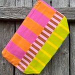 This fully lined small wedge will comfortably hold your in progress small accessory projects. It is approximately 8 inches tall, 13 inches wide and 4 inches deep. A loop handle attaches to the zipper via a swivel clasp for knitting "in the wild".