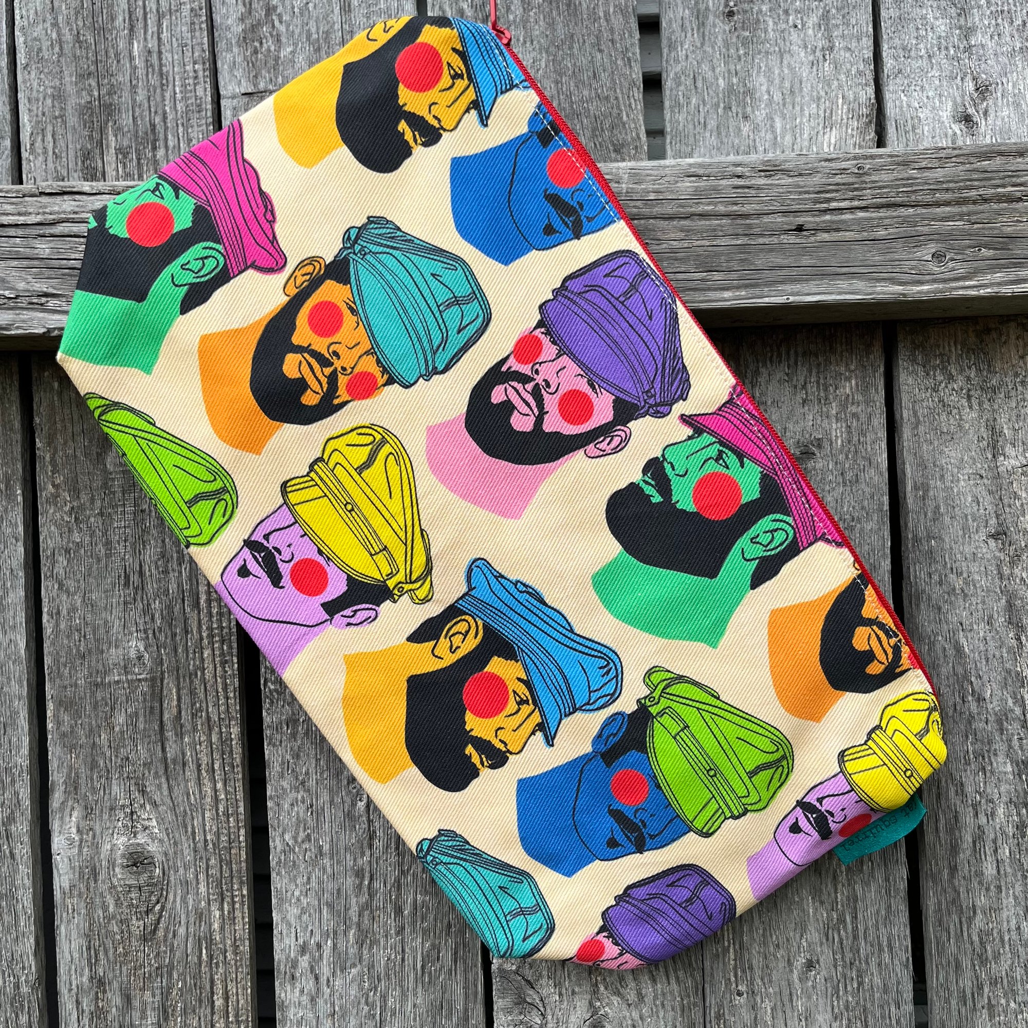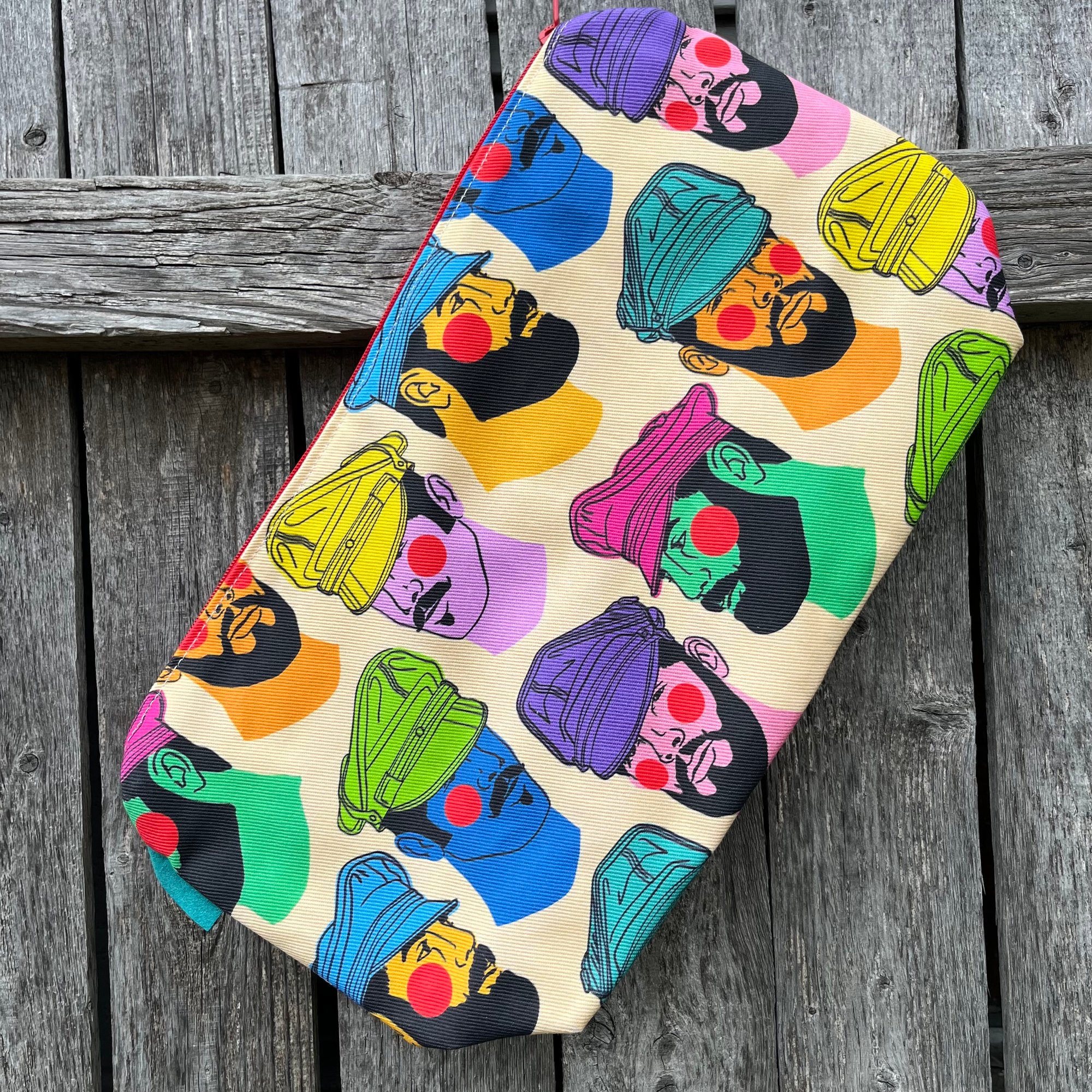 This fully lined large wedge bag will hold three 100 gram skeins of yarn and is suited to most accessory projects. It is approximately 15 inches wide, 8 inches tall and 4 inches deep. A loop handle attaches to the zipper via a swivel clasp for knitting "in the wild".