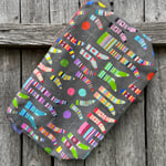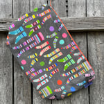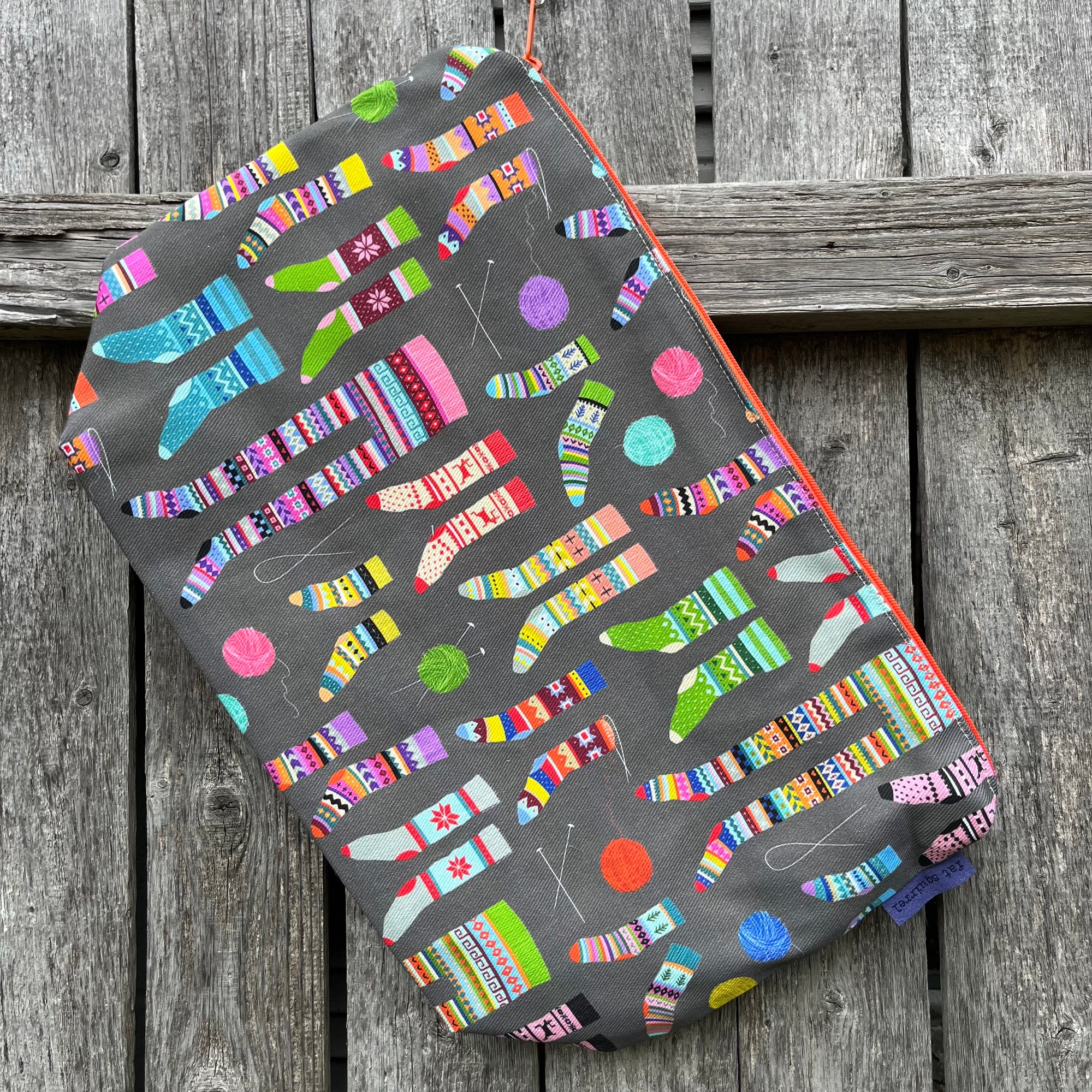 This fully lined sweater bag will hold six 100 gram skeins of yarn and is suited to large shawl and smaller sweater projects. It is approximately 17 inches wide, 10 inches tall and 5 inches deep. A loop handle attaches to the zipper via a swivel clasp for knitting "in the wild".